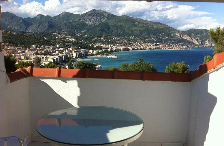 La terrazza ornata da balaustre invita a godere di una vista panoramica sul mare e fino all'Italia, offrendo uno scenario idilliaco per momenti di relax e contemplazione.